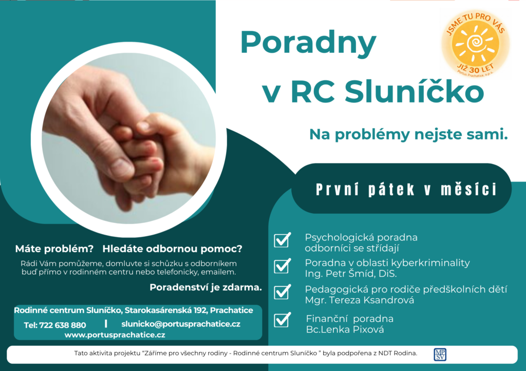 Aktivita Poradenství v projektu Záříme pro všechny rodiny – Rodinné centrum Sluníčko byla podpořena z NDT Rodina a Jihočeský kraj.