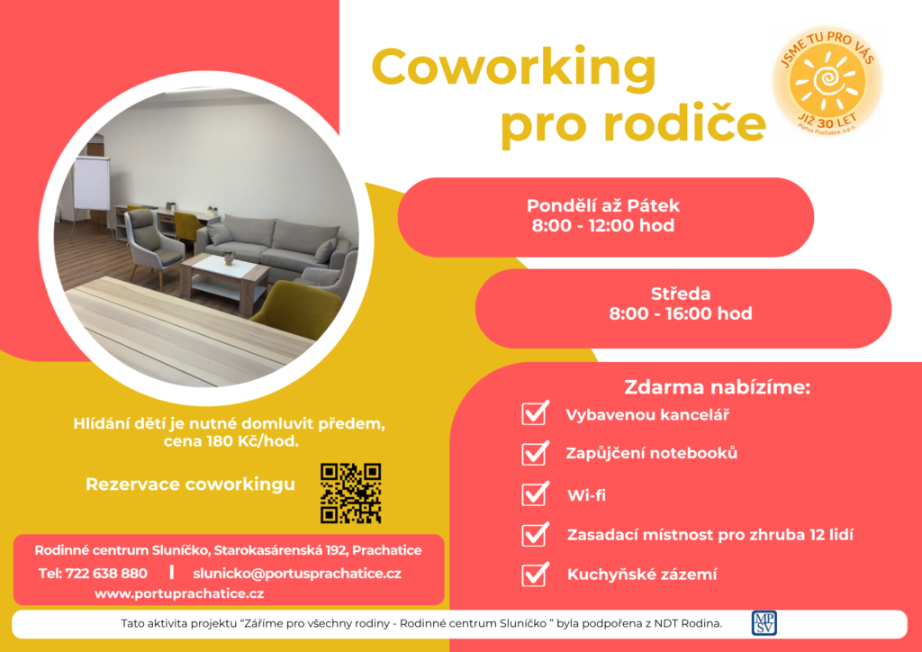 Podnikáte, chcete začít podnikat nebo hledáte práci? K tomu pečujete o malé dítě? Potřebujete chvíli klidu na soustředěnou práci? Nebo inspiraci? Potřebujete se setkat s klientem? Nevíte co s dítětem? Příjďte k nám. Nabízíme prostor sdílené kanceláře s možností využit počítač, tiskárnu, Wi-fi, kuchyňské zázemí s kávovarem. Během toho co budete pracovat, tak Vám smysluplně pohlídáme děti.